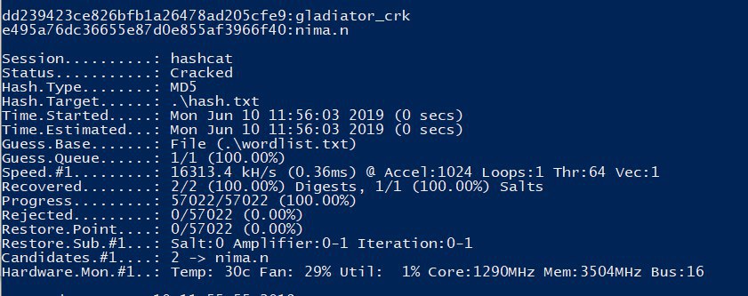 There are two hashes labled as “HashKey_1″and “HashKey_2” If we decrypt these hashes this is what we get. dd239423ce826bfb1a26478ad205cfe9 gladiator_crd e495a76dc36655e87d0e855af3966f40 nima.n